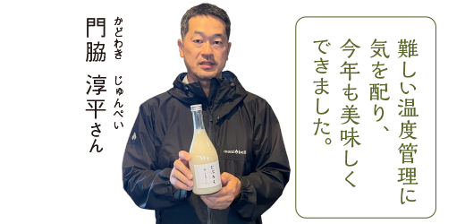 松江市八束町のお米を「黄麹」で発酵させた香り豊かなお酒です。濃厚な甘口なので、そのまま飲むのが一番。そして、吟醸酒のようなフルーティーで華やかな香りが漂います。発酵の状態を見ながら微妙な温度管理を徹底し、2〜3週間かけて丹念に製造されています。