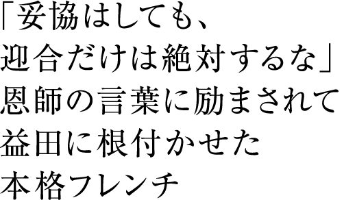厳しい修行を積んで、28歳で益田に帰ると、翌年には『レストラン・ボンヌママン・ノブ』をオープン。けれど経営は、順風満帆とは行かなかった。「オープンして最初の3ヶ月は忙しくて。このペースだったら、すぐ借金が返せると思っていました。でも、その後はパッタリお客さんが来なくなって」さらに、多くのお客さんが「ハンバーグないの?」「パスタはないの?」と言ってくる。そんな状態が1~2年続いたが、それでも耐えられたのは、東京でお世話になった尊敬するシェフの、こんな言葉だった。