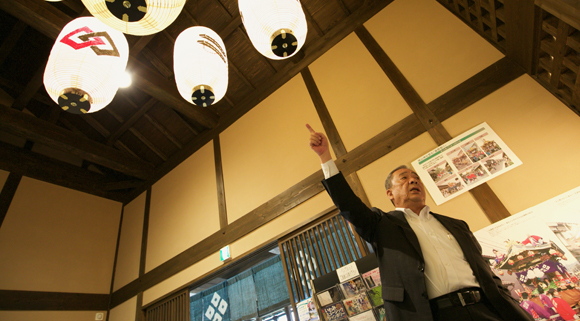 館内に入ると、先ず鹿野祭りゆかりの大提灯7張を見上げて、それから特産品販売コーナーの奥に進むと、当館の館長でもある長尾裕昭隊員が待っていてくださった。亀井のお殿様ゆかりの生姜を使った〝シロップ〟や〝地ビール〟、密かに人気の〝鹿野の妖精ウマモナド〟など、一通り紹介をしていただいて、お茶・お食事処でお話を伺うことにした。