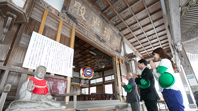 「奇しくも“やくし(薬師)”の年。偶然とは思えないですよね。」と藤岡大拙隊員。ひとりの漁師が海から薬師如来像を引き揚げて、お祀りしたのが始まりです。その後、盲目の母の目が開いたり、戦国の時代に幼い子どもたちの命が助かったりしたことから、目のお薬師様、子どもの無事成長の仏様として、広く信仰されています。8万坪という広大な境内を巡り、