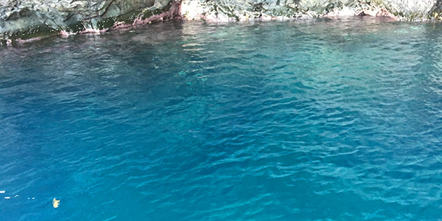 とにかく蒼く澄んでいて美しい。8m下の海底の石にすぐ手が届きそうに思えるほどで、別名を〝青の洞窟〟。佐太大神の誕生の地として伝わるこの洞窟には、その昔、加賀神社があったのだそう。その証拠に、岩の上には白い鳥居が今も建っています。
