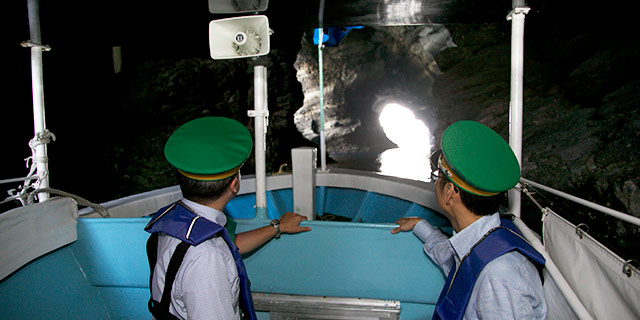遊覧船が入っていったのは、高さ40m・長さ200mの〝神の洞窟〟といわれる『新潜戸』。船の幅いっぱいいっぱいの洞内に、ぶつからないようにするのは、船長の腕の見せ所です。
